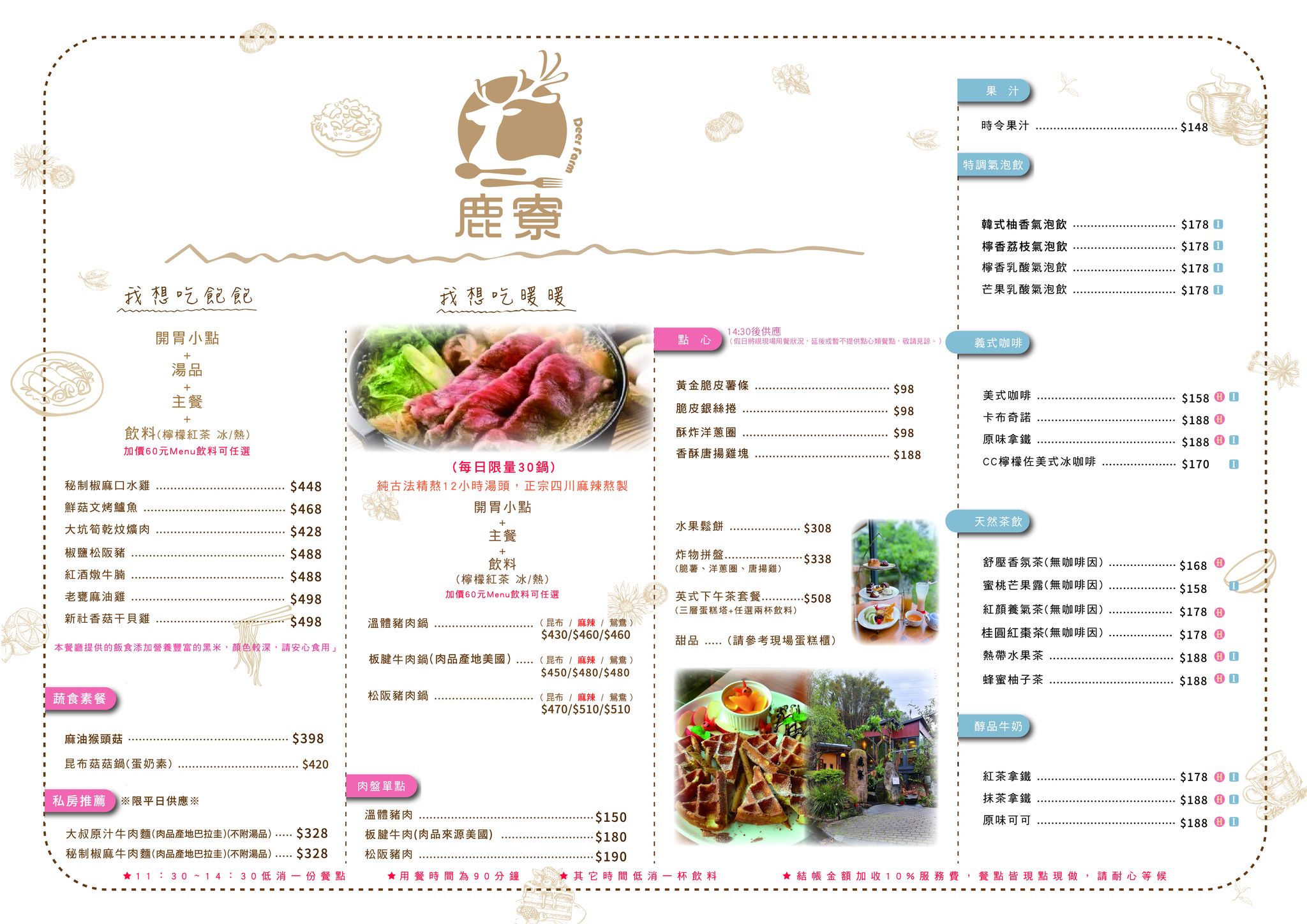 鹿寮享自在 鹿寮享自在 溫體肉鍋物|創意料理|下午茶古樸與設計風格並存的餐廳餐點合併中西式料理擷取義式料理精神提供顧客天然健康、無負擔料理營業時間:11:30~18:00餐廳訂位電話04-22396305 本月菜單 Facebook Instagram