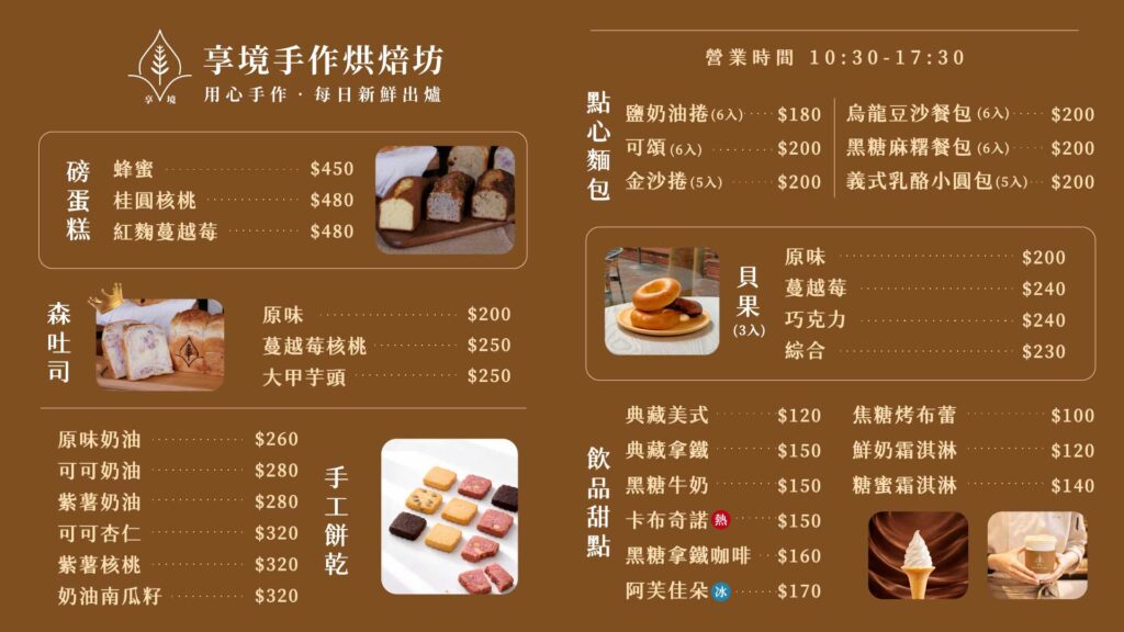 享境烘焙坊 【 落羽松森林裡的手作烘焙坊 】用手作的溫度,揉進時間與心意讓麵粉、奶油與空氣一起發酵成剛剛好的日常森吐司 | 磅蛋糕 | 鹽奶油捲訂購請加LINE:@siangjing營業時間:10:30~17:30每週三店休 Facebook Instagram Comment-dots